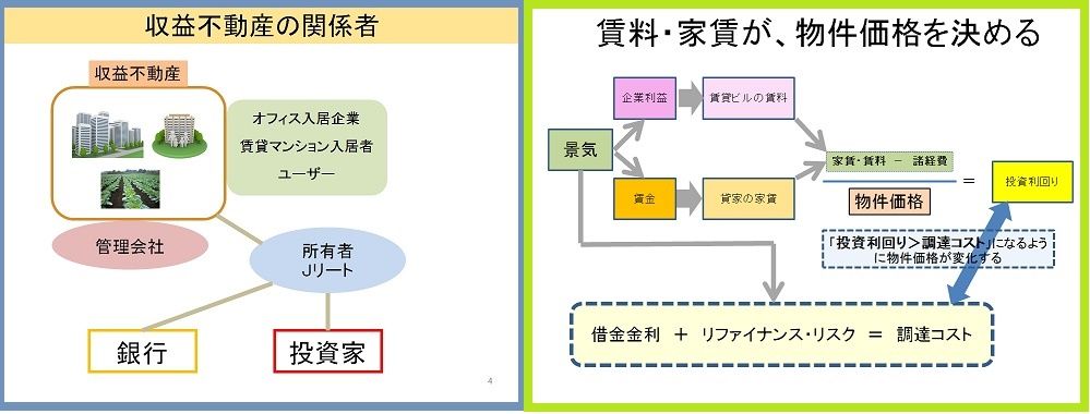 上図右側に図示されたように、収入が景気動向によって上下動するなら、収益不動産の価値(=取引価格)も、値上がりしたり、値下がりしたりする。