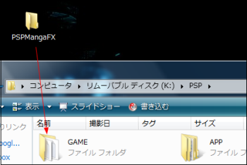 2・PSP→GAMEフォルダに「PSP MangaFX」をフォルダごとコピーします。