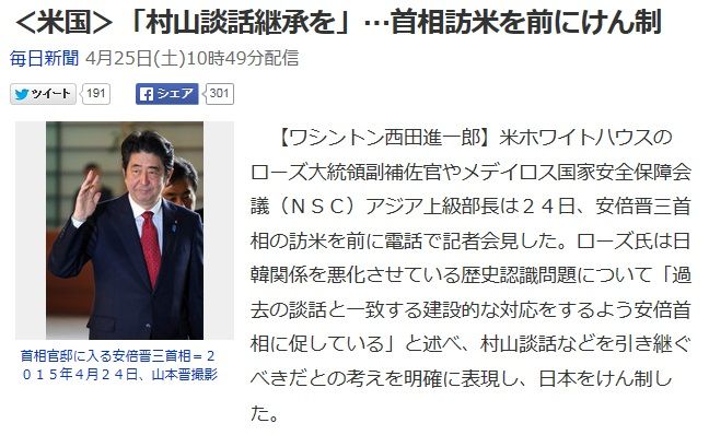 なお、同勉強会の席上、米国からの村山談話継承に関するニュースの出処は朝鮮系の聯合ニュースであり、その聯合ニュースが米国務機関の下っ端役人による私的な会話を基にしたニュースであったことが確認されたので、そのことを付記しておく。