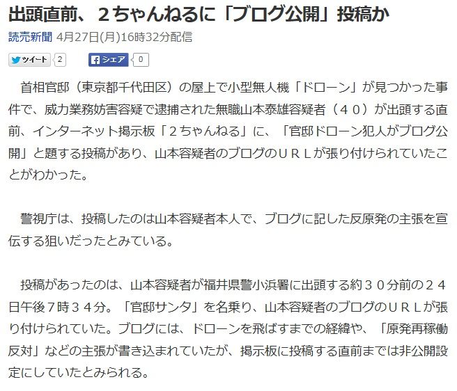 官邸ドローン侵入犯・山本泰雄容疑者の投稿が示す、