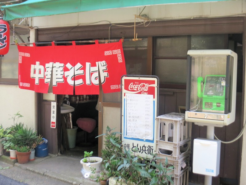 住宅街の緩やかな坂を下っていくと、灰色の風景の中にひときわ目立つ赤い暖簾の中華そばとん兵衞@西新宿五丁目(渋谷区本町)。