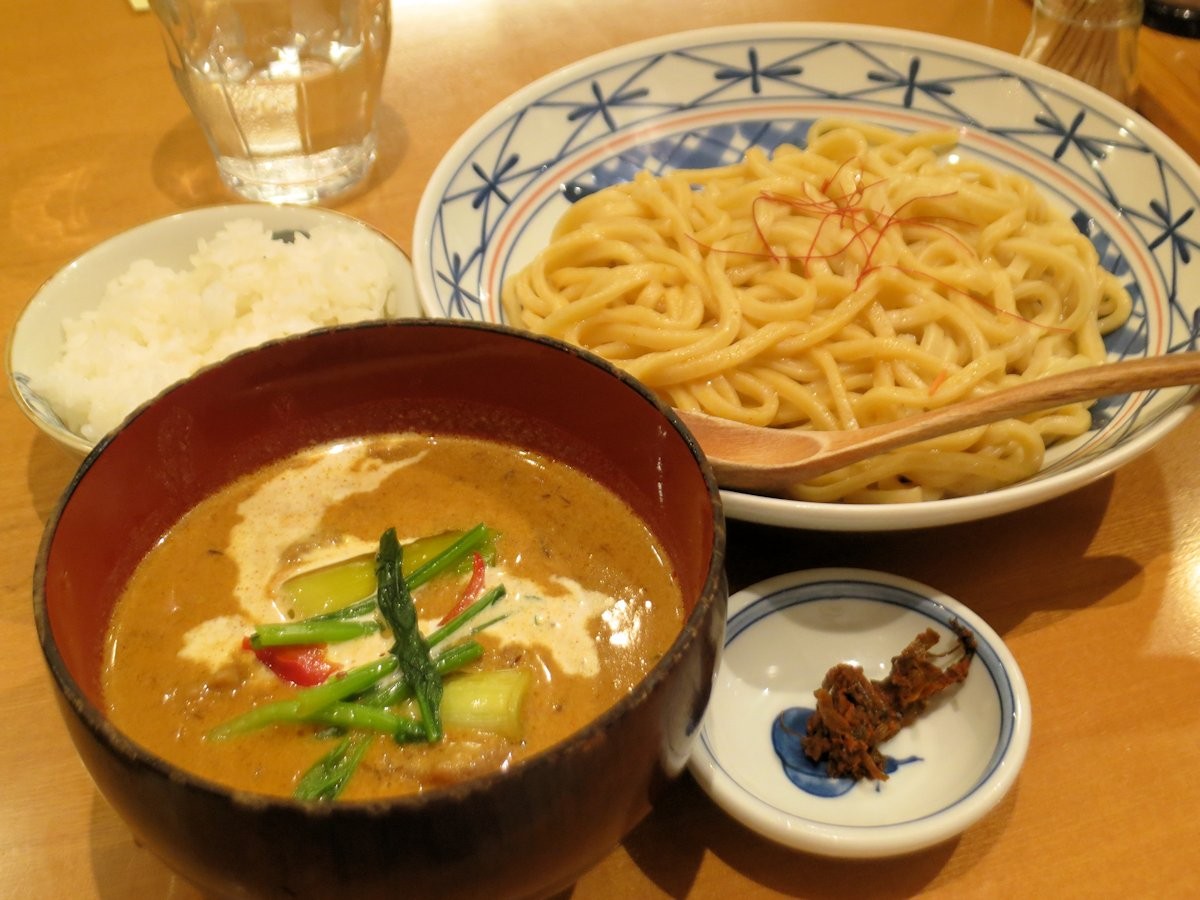 つけ汁には牛すじ、焼き長ネギ、赤パプリカ、茹でほうれん草と彩りも鮮やかです。