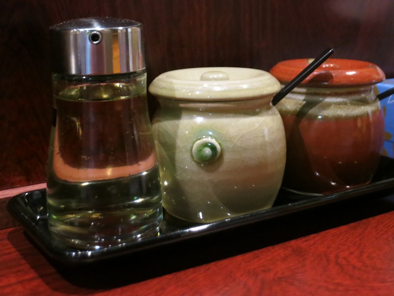 お店は定食屋さんなので、卓上の調味料はドレッシングやソースだけであり、一般的なラーメン屋なら普通に用意されている胡椒類や酢が無いんですね。