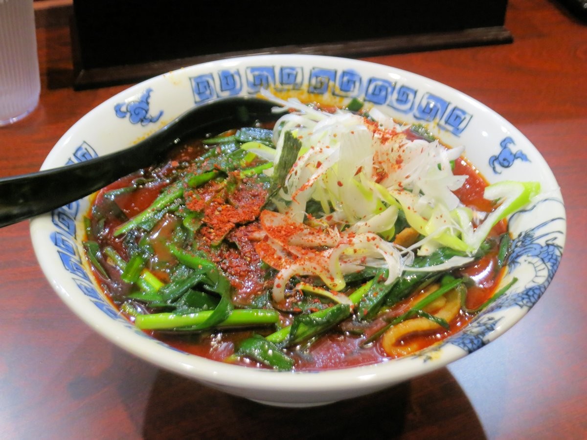 むせ返るほど辛いのですが、豚ばら肉の食感も良く、さらにトッピングしたニラが最高の伴侶を得たとばかりに辛さ、旨さを盛り上げます。