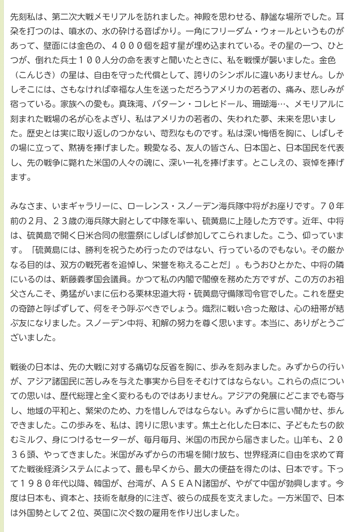 金色の星は、自由を守った代償として、誇りのシンボルに違いありません。しかしそこには、さもなければ幸福な人生を送っただろうアメリカの若者の、痛み、悲しみが宿っている。家族への愛も。真珠湾、バターン・コレヒドール、珊瑚海…、メモリアルに刻まれた戦場の名が心をよぎり、私はアメリカの若者の、失われた夢、未来を思いました。歴史とは実に取り返しのつかない、苛烈なものです。私は深い悔悟を胸に、しばしその場に立って、黙祷を捧げました。親愛なる、友人の皆さん、日本国と、日本国民を代表し、先の戦争に斃れた米国の人々の魂に、深い一礼を捧げます。とこしえの、哀悼を捧げます。