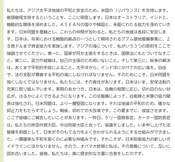 この法整備によって、自衛隊と米軍の協力関係は強化され、日米同盟は、より一層堅固になります。それは地域の平和のため、確かな抑止力をもたらすでしょう。戦後、初めての大改革です。この夏までに、成就させます。ここで皆様にご報告したいことがあります。一昨日、ケリー国務長官、カーター国防長官は、私たちの岸田外務大臣、中谷防衛大臣と会って、協議をしました。いま申し上げた法整備を前提として、日米がそのもてる力をよく合わせられるようにする仕組みができました。一層確実な平和を築くのに必要な枠組みです。それこそが、日米防衛協力の新しいガイドラインにほかなりません。