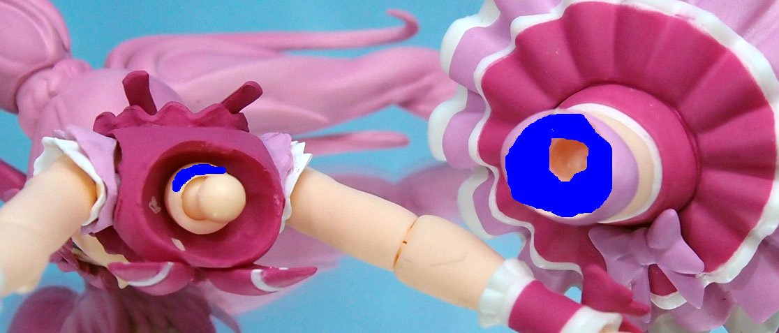 >>上腕のハメコミ部分のもっこりしてるの以外は満足だよ >これ、ダイヤモンドの手首も気になったな。 >両方ともとっても細い部分だから、軸径と素材強度の兼ね合いの問題かな? >結構目立ちますしなんとか後続商品で改善されていってほしいポイントですわ。 比較相手が結構前の商品だけど肩関節から上腕引っこ抜いてみた 初めて気づいたけどブラックも若干モッコリ、でも上腕の真ん中が太くなっていく構造なので目立たない それに加えてジョイント先っぽの鉤部分もメロディのほうは軸と比べて大きくなってるので穴の内壁を拡げてそう この部分を保持が危うくならない程度に削れば改善するかも? | ||