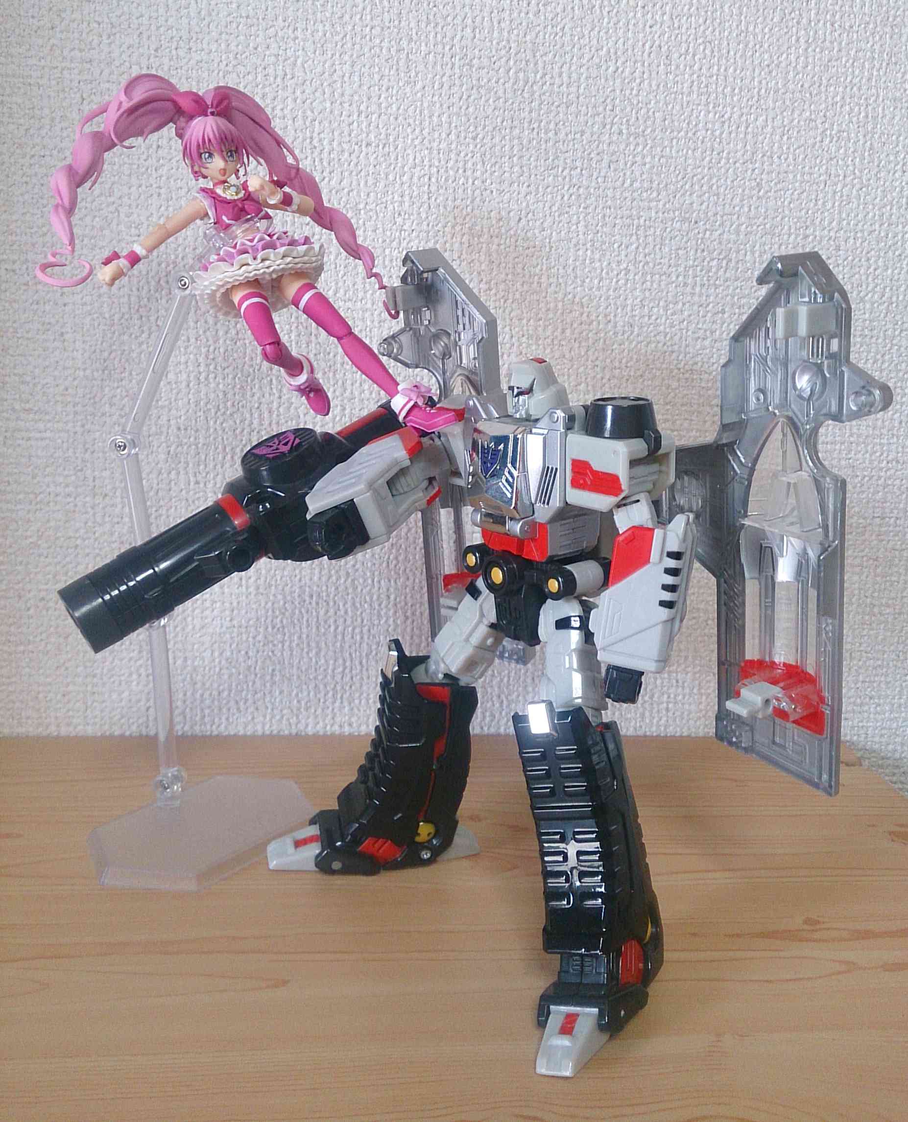 有名な68話『復活のH(ハウリング)』再現 敗北を喫したハウリングが復活して今度はハミィを人質(猫質)に 激怒したメロディが発したパワーでベルティエから巨大な剣が生成されてハウリングを真っ二つにするというシーン 因みにハウリングさんが立体化されていないので最古ガンダムMkⅡさんに代役頼みました | ||