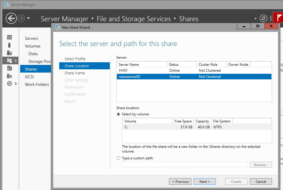 Microsoft-NanoServer-Storage-Package (FileServer Role) な Nano Server にも ServerManager-Core-RSAT* を入れて、さらに File-Services (同時に CoreFileServer も入る) を入れたら、Server Manager から共有管理できるようになりました。 データ重複除去 (Dedup-Core) や、ストレージ レプリカ (Storage-Replica) にも対応しているようです。