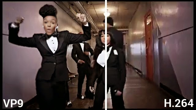 Janelle Monaé を通信速度 600Kbps で VP9 と従来の H.264 変換で視聴した場合の質の違いを次の画像で比べてみてください。