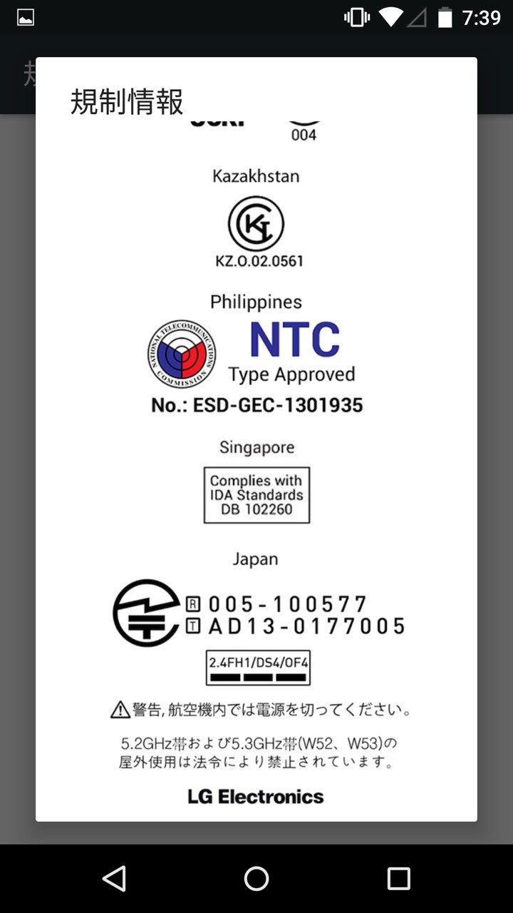 以下、実際にNexus 5にAndroid Mを導入してみた主な画面のキャプチャー。毎度のことながら、技適マークがあってひとまず安心(;´Д`)