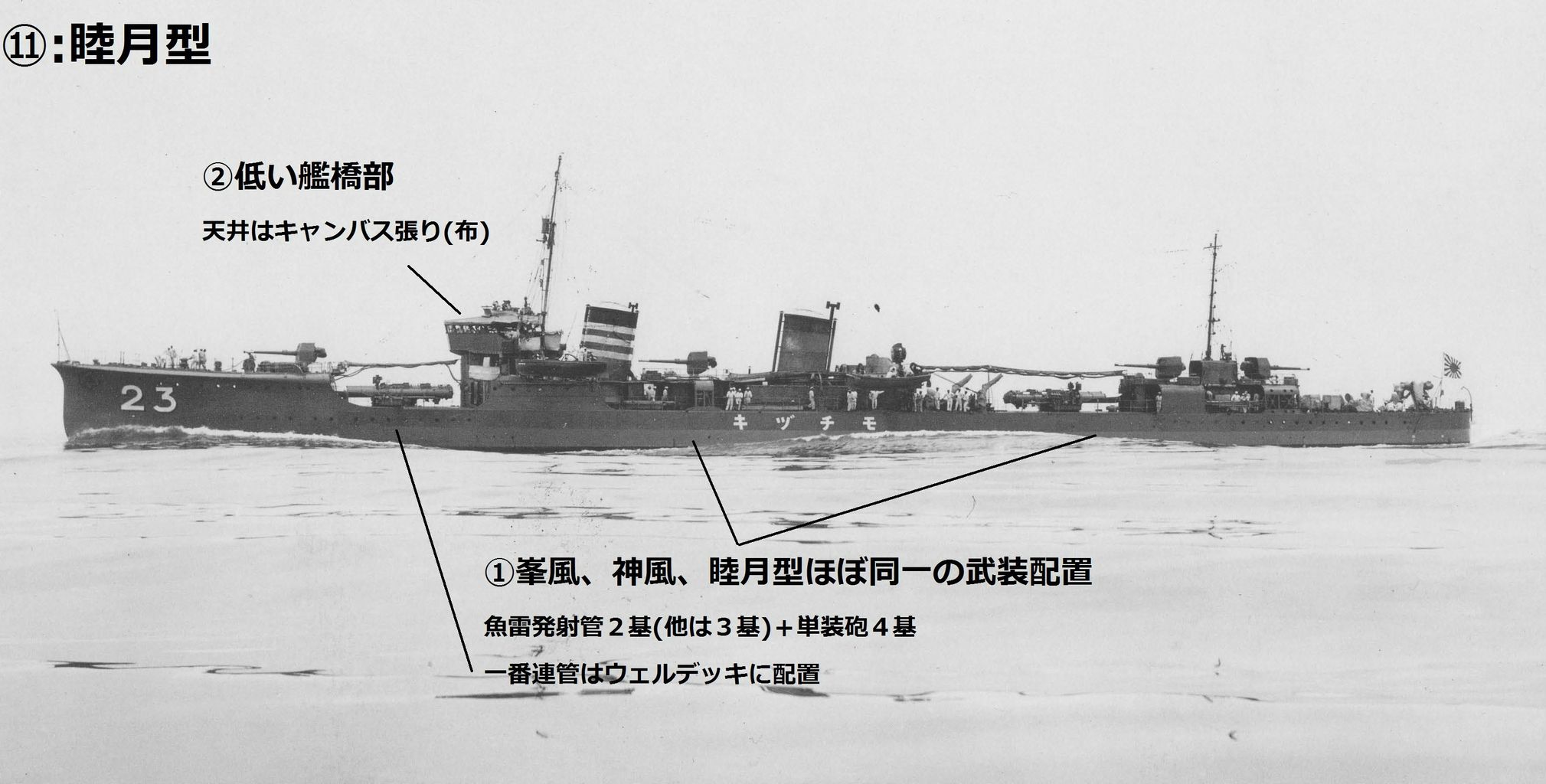 睦月型は魚雷発射管が三連装二基(峯風・神風型は連装三基)だから比較的判別は楽よ。