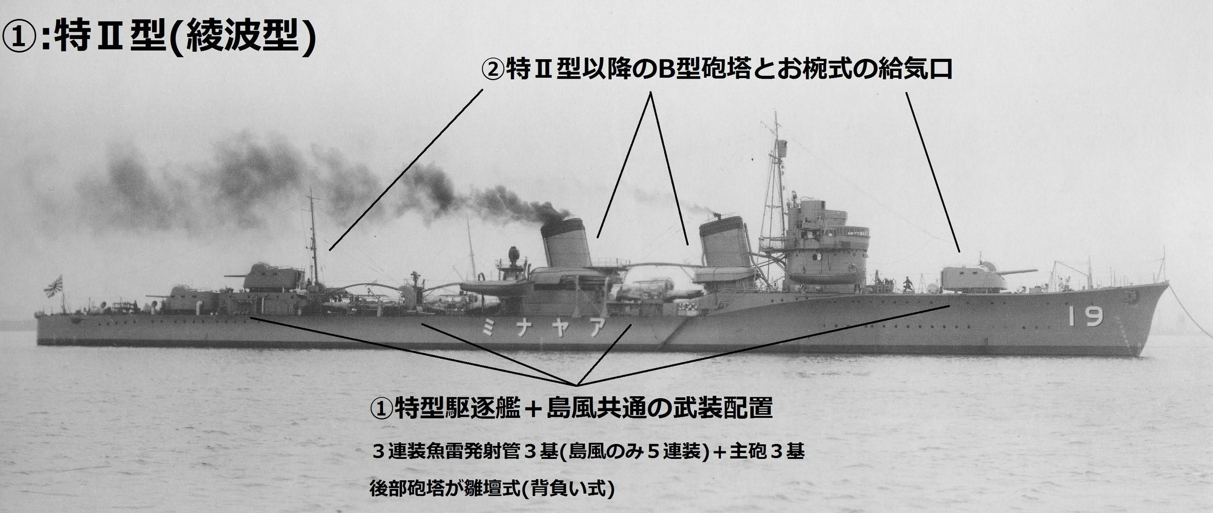 睦月型は魚雷発射管が前後に1基づつなのに対して神風型は前1基後2基、峯風型はさらに主砲の配置も違う