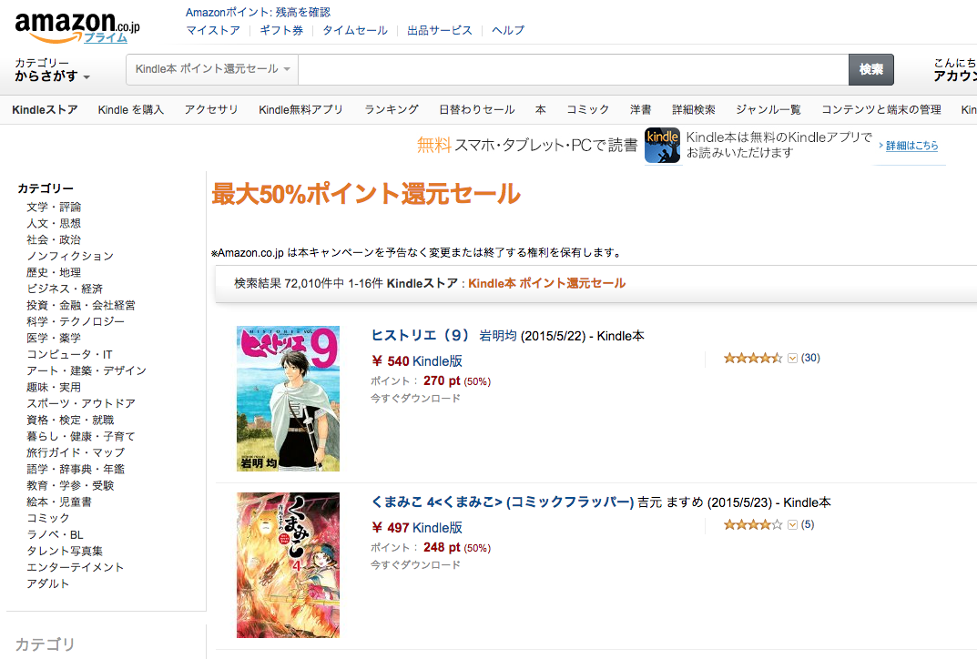 Amazonが実質半額セールを行っており話題となっています。これは購入した本の50%がポイントとして付与されるという仕組み。