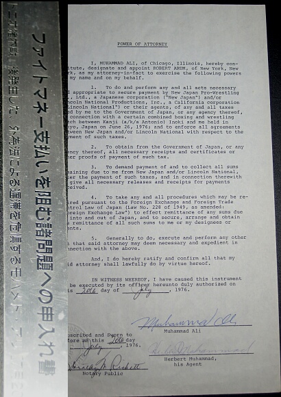 それを迷わず、私が落札したもの。この1戦を前に、小生は某出版社ホノルル特派員とし て「アリ・猪木戦PPV」の記者会見で初対面となった新間さん。そのまさにグローバルな異 能ぶりには感服申し上げてきたものだったが、まさかこんな形で邂逅を得るとは思わなか った。(全体写真、左隅に額装の際にご利用頂けるよう、ステンレス製特注プレートを付属 させ、私の署名捺印入りの保証付き「真正証明書」が添付されます。)