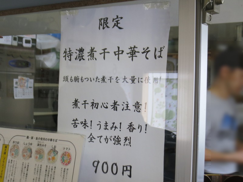 限定特濃煮干中華そば900円、『頭も腑もついた煮干を大量に使用!煮干初心者注意!苦味!うまみ!香り!全てが強力』との説明されています。