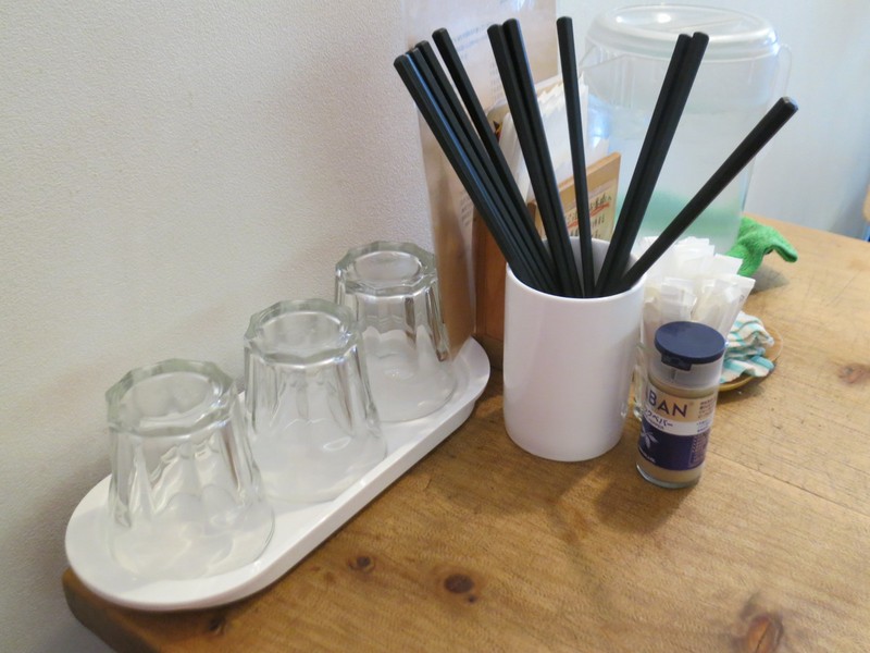 かなりゆったりしたレイアウトで、カウンター5席、テーブルは4人掛けと2人掛けが2卓ずつ。
