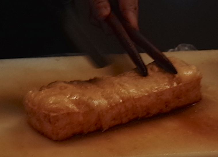 そして揚げたてでパンパンに膨らんでいる油揚げをダイナミックに肉切り包丁でザクッザクッと切っていく。