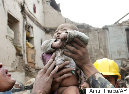 Sita Khanal holds her nine-year-old son Nishan in her arms as they and others watch a US search and rescue team work at the site of a collapsed building where earlier a fifteen-year-old boy was found alive in the rubble in Kathmandu on April 30, 2015. The US team was looking for two more survivors who were allegedly speaking with the rescued teenager. The rescue of Pemba Lama, who stayed alive by eating jars of ghee, was hailed as a miracle by medics and met with cheers from crowds of bystanders who massed to watch the drama unfold. AFP PHOTO/ROBERTO SCHMIDT (Photo credit should read ROBERTO SCHMIDT/AFP/Getty Images)