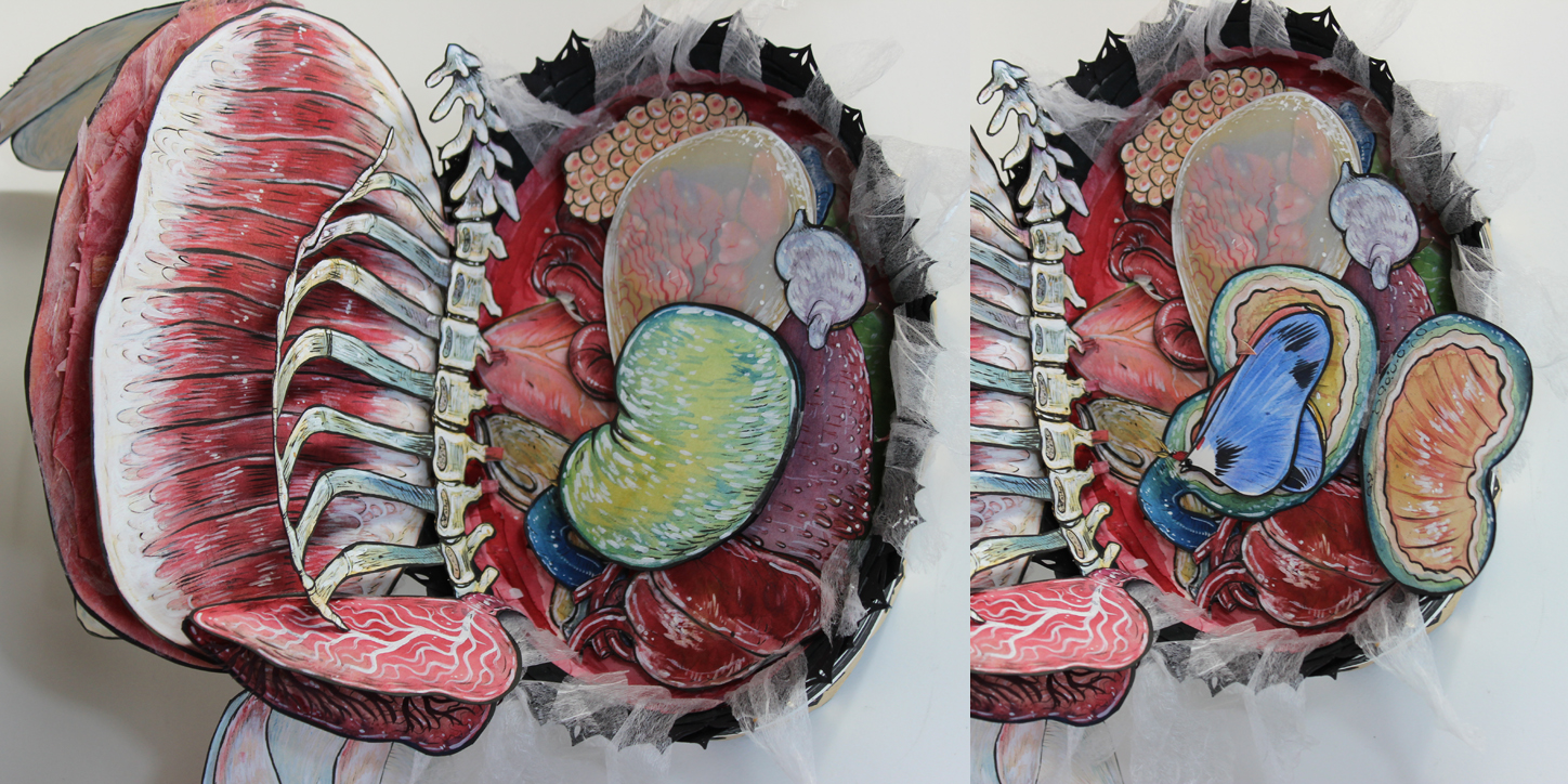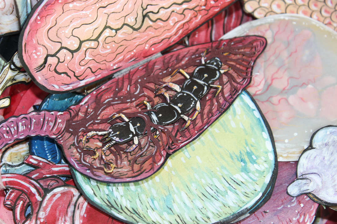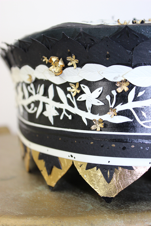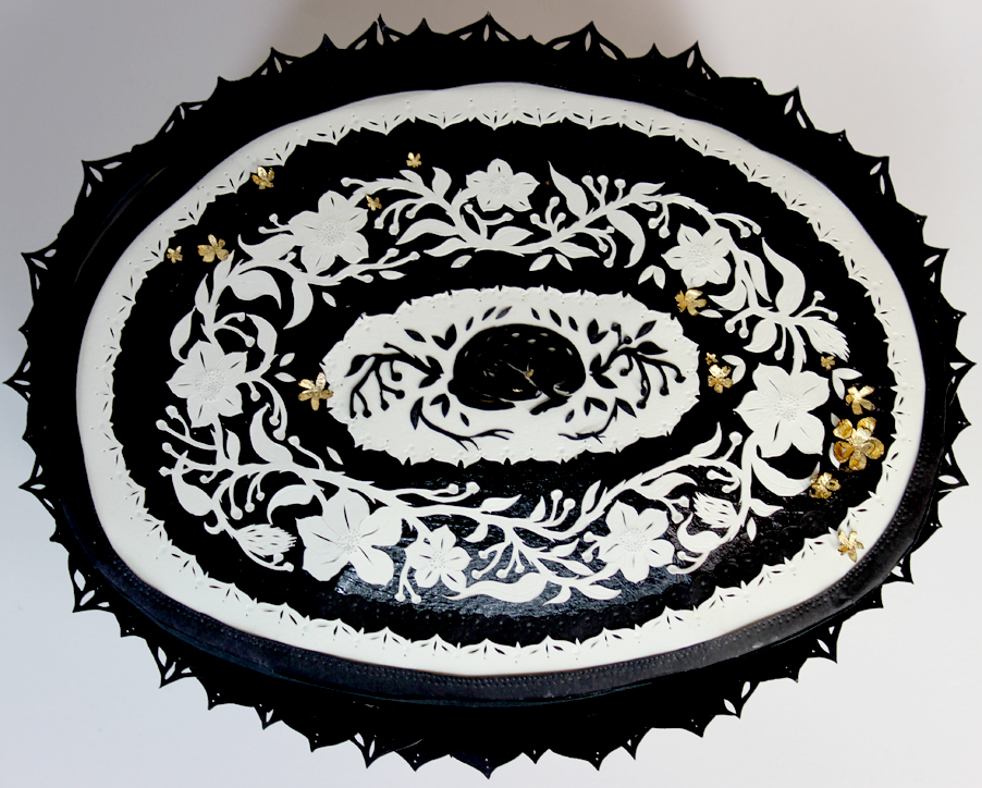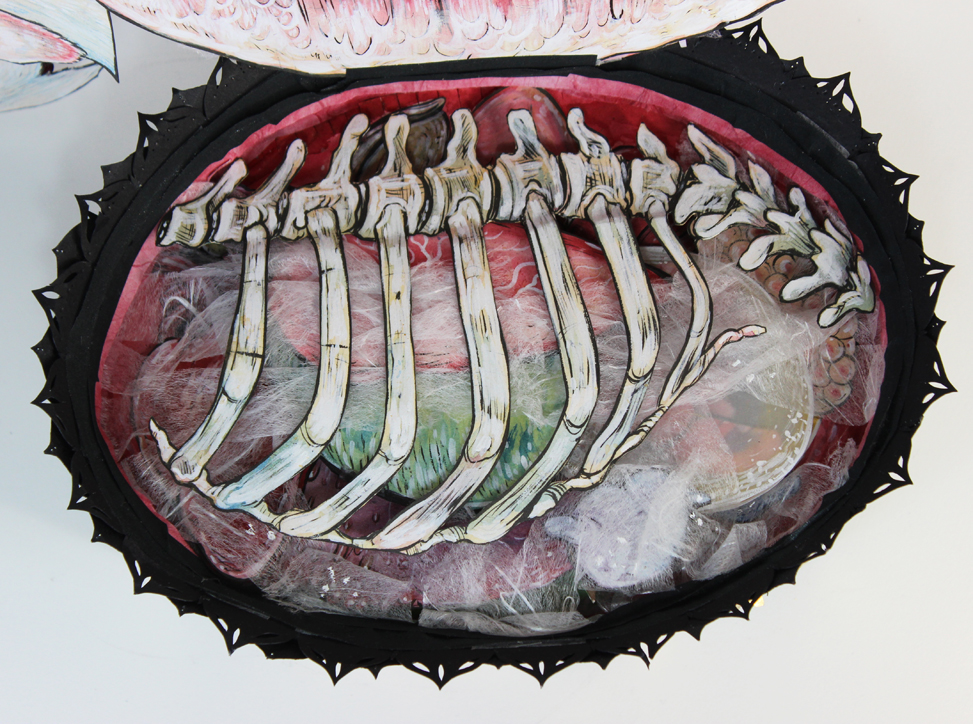 This piece is constructed out of paper and decorated with ink, water colour, and gouache.