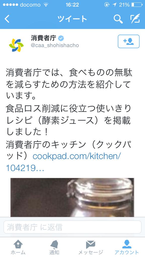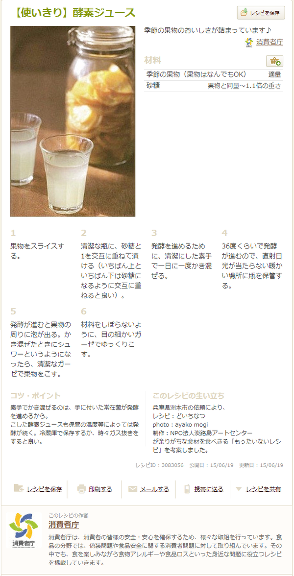 同庁によると、同日午後3時頃、人気レシピサイト「クックパッド」に開設する同庁のコーナーで、同庁消費者政策課の職員が果物を発酵させるジュースの作り方を紹介した。