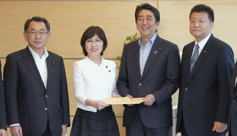 「次世代への責任」を強調した自民党の財政再建に関する特命委員会。最終報告は6月末にもとりまとめられる財政健全化計画にどう活かされるのか(報告書を安倍首相に手渡す稲田朋美・自民党特命委員長(政調会長)、左から2番目、写真:共同通信)