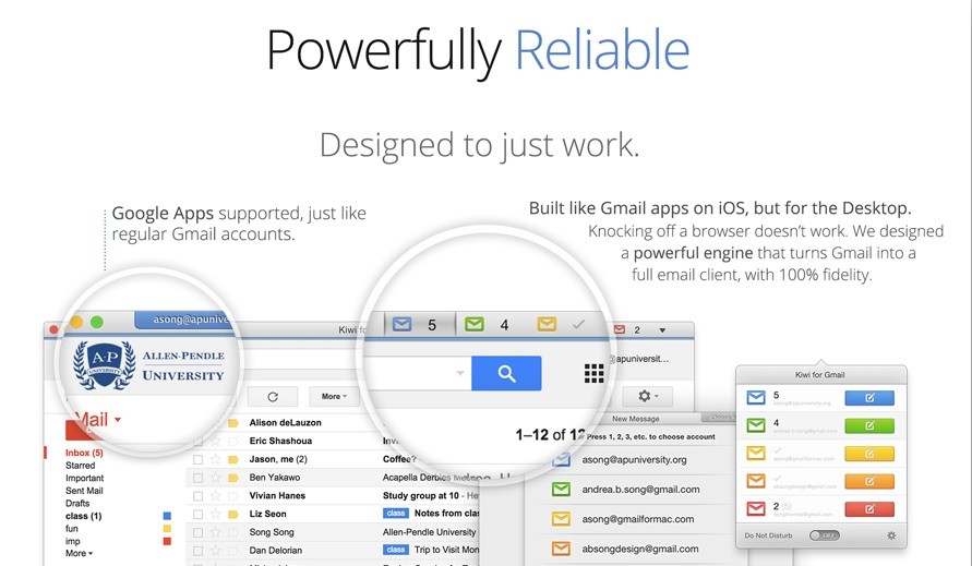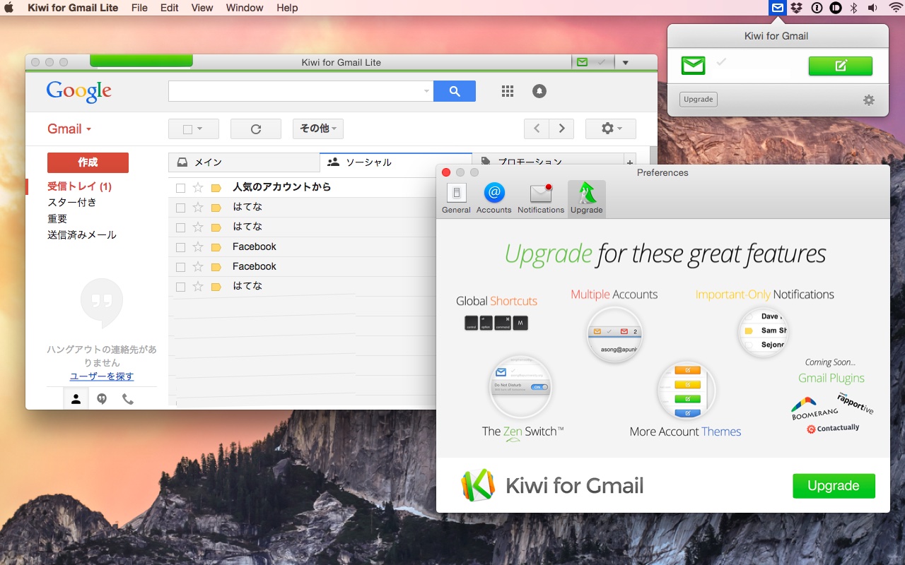 Kiwi for Gmailはその名の通りGmailに特化したメールクライアントで、Gmailをラッパーしただけではなく通知センターやメニューバーユーティリティ、複数アカウントの切り替え、メールの通知を止めるZenスイッチ、グローバルショートカットキー、Yosemiteの機能拡張などの機能を提供しています。