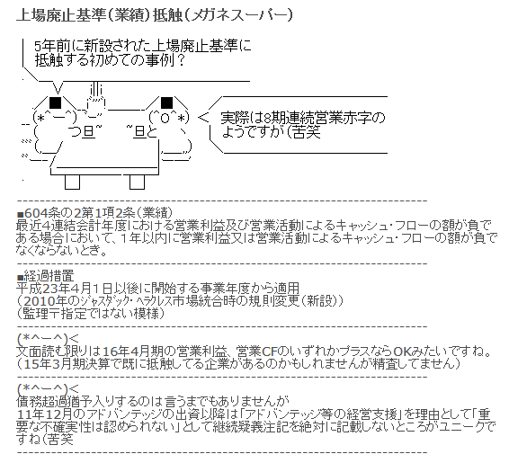 メ ガネスーパー上場廃止リャンメン待ち>>平成28年4月期末におきまして債務超過が解消されない、又は、平成28年4月期におきまして営業損失を計上し、 かつ営業キャッシュフローがマイナスに留まった場合には、株式会社東京証券取引所の上場基準に抵触し、上場廃止になる可能性があります。