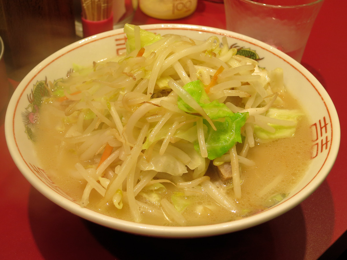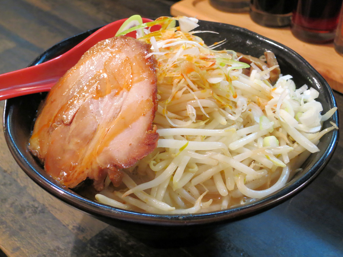 スープは濃厚豚骨で、いい感じに旨味が煮出されていますが(恐らく圧力釜使用)、もやし95%にキャベツ5%の炒め野菜の水分で薄まってしまっています。