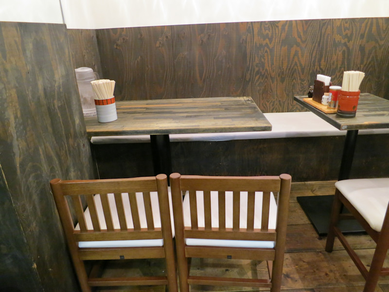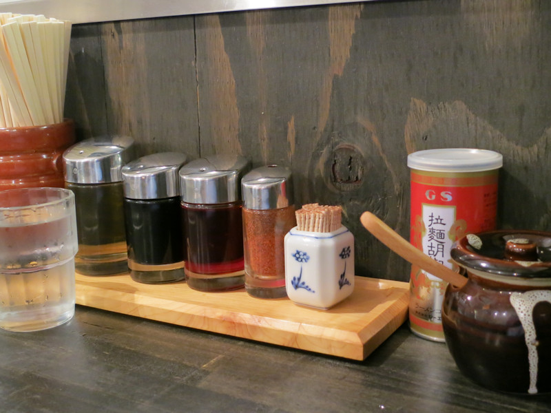 カウンター6席、テーブル18席とそれなりにお客さんがは入れる店内、卓上には豆板醤、白胡椒、七味唐辛子、酢、醤油、辣油が揃っています。
