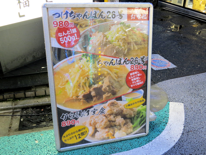 メニューは「長崎ちゃんぽん880円」、ラーメン二郎インスパイアの「ちゃんぽん26号890円」、「つけちゃんぽん26号980円」のラインナップです。
