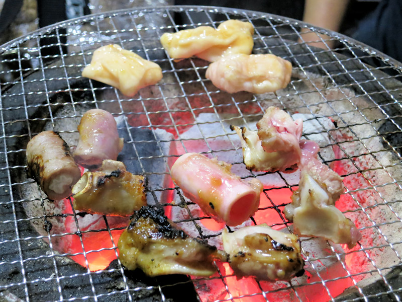 私は定番のナンコツ二人前、彼はシロ一人前、七輪の炭には既に火がついているので、ホルモン焼きスタート。