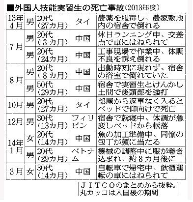 政府が受け入れ拡大を図る外国人技能実習生の労災事故が、2010年に労働環境に配慮し制度が見直された後も増えており、13年度に初めて1千人を超えた。東海3県が上位を占め、岐阜では異例の過労死認定へ手続きが進む。