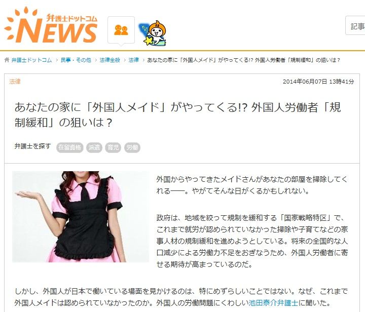 このニュースからも明らかなように、ごく一握りの米国人企業幹部の要求によって家政婦という一分野といえども日本の労働市場が開放されようとしているのである。