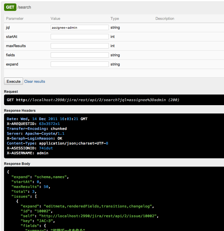 /search を選択し、jql フォームに assignee=admin と入力し、Executeボタンを押下します。