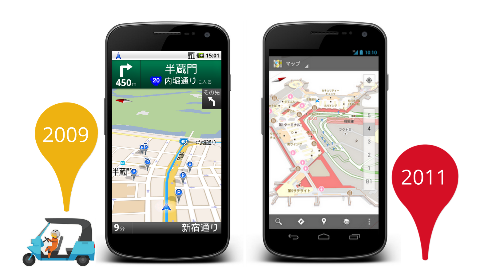 この 10 年で、世界 10 億人の方にお使いいただくサービスに成長した Google マップは、日本との関わりの中で、多くを学び、改善を重ねてきました。これほど町が複雑で、道路が入り組み、正確に電車が走り、心から地図を愛するこの国に向けて、地図を作り、みなさんに鍛えていただいたことが、日本だけでなく、世界中の Google マップを大きく進化させる原動力となりました。