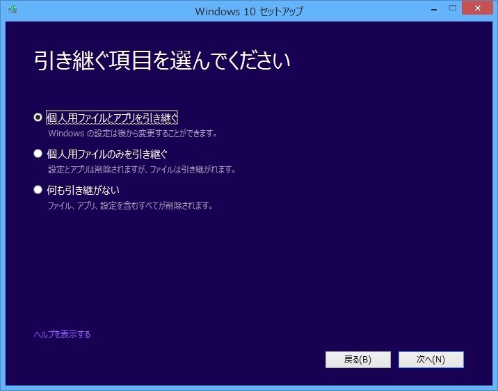 PCのチェックを通過すると「ライセンス条項」が表示され、同意後に引き継ぐ個人用ファイル(設定ファイルなど)の設定画面が開き、「ファイルを引き継ぐ」または「何も引き継がない」を選択できます。