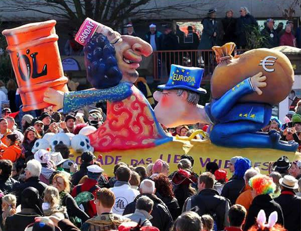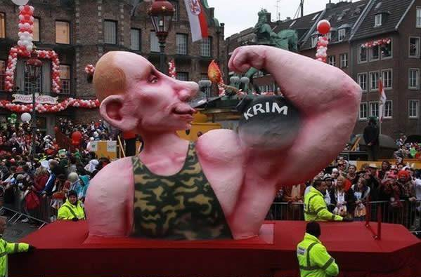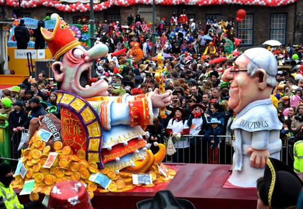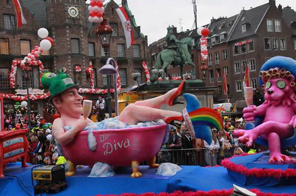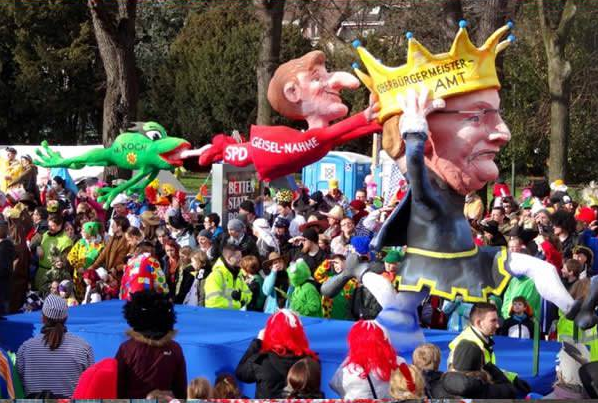 いろいろな仮装をした音楽隊や、ダンズグループ、騎士団などが、パレードの列に続きます。巨大な紙の像が載った車両が通過していきます。カーニバル参加者はこの様な像に政治家や政策に対する批判を込めるのです。風刺にインスピレーションを与えるのは、失業や財政難、連立政治、原理主義などです。このような政治批判には伝統があります。薔薇の月曜日の祭りが始まった19世紀初頭には当時ラインラント地方で嫌われていたプロイセンを槍玉に挙げ、その軍隊式のしきたりを嘲笑したのです。