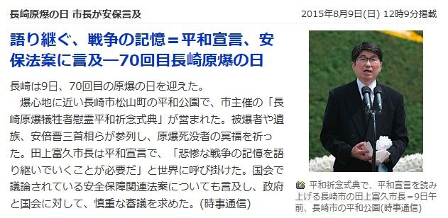 9日に70回目を迎えた「長崎原爆の日」では長崎市長が原爆投下の被害に絡め、国会で審議が進む安保法案に言及したことは、まことに頂けない。