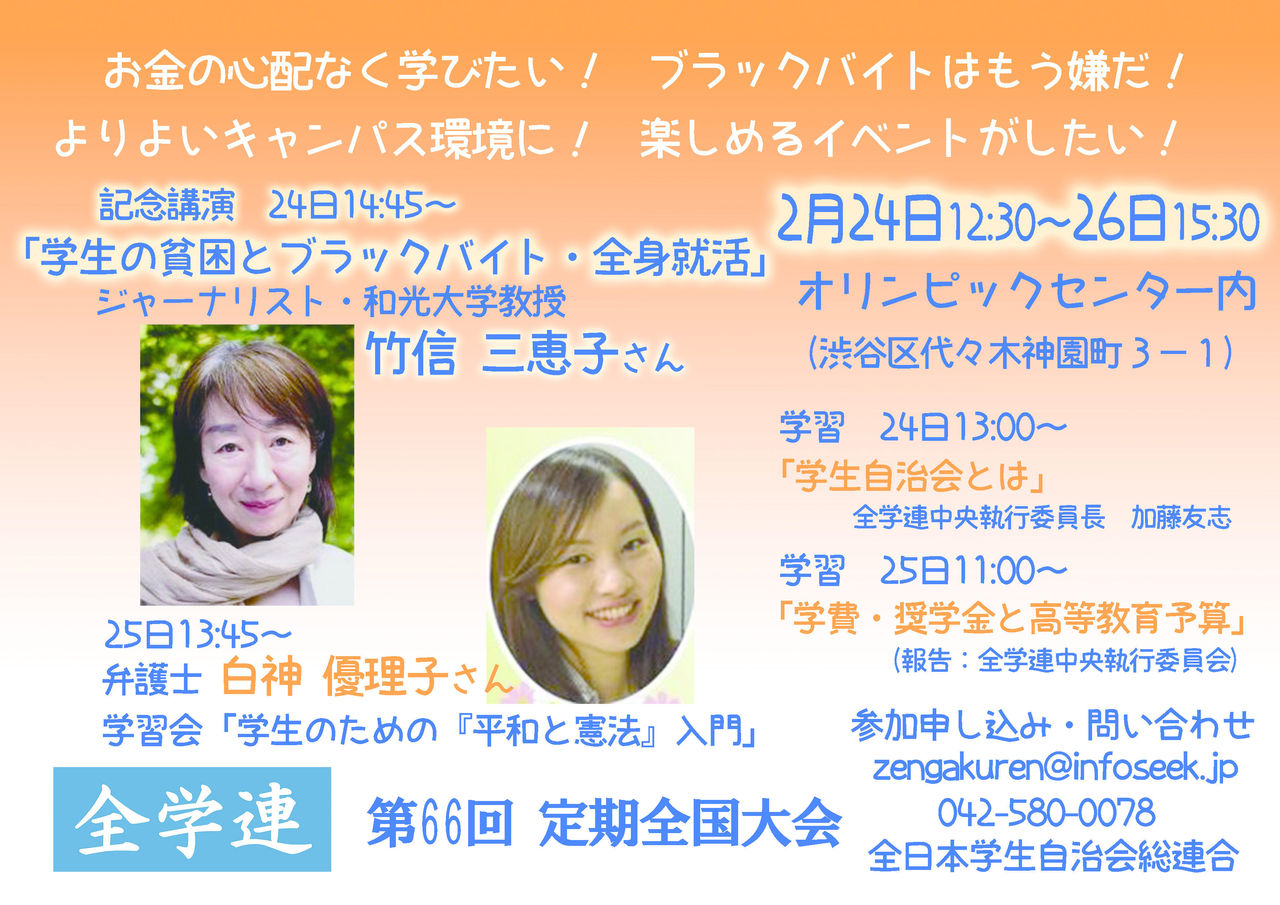 私たち第66期中央執行委員会は大会での討論と決議を基に、加盟学園以外を含む全ての学生の要求実現のために精一杯活動していますのでこれからもご理解とご協力をよろしくお願いします。