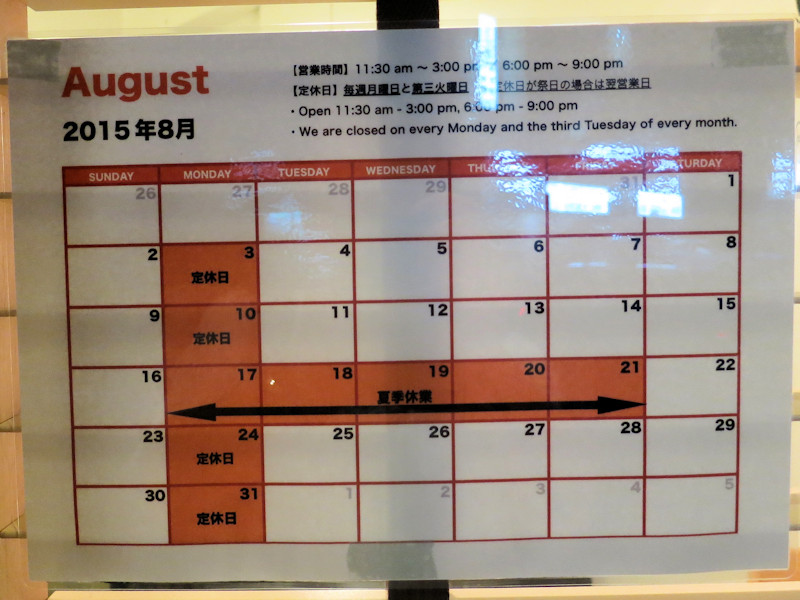 店先に今月の休みが掲示されていて、ブログでも告知されていますが、来週8/17から8/21が夏休みとなります。