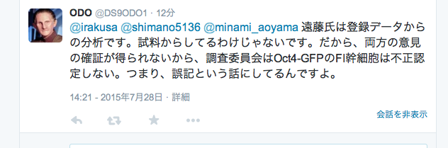 下のODOハカセのコメントは小保方博士がSTAP幹細胞がES細胞ではない、とする実験をしてES細胞ではなかったとする報告書を出した、事をさしています。しかしSTAP幹細胞を作ったのは若山博士なんですよ。