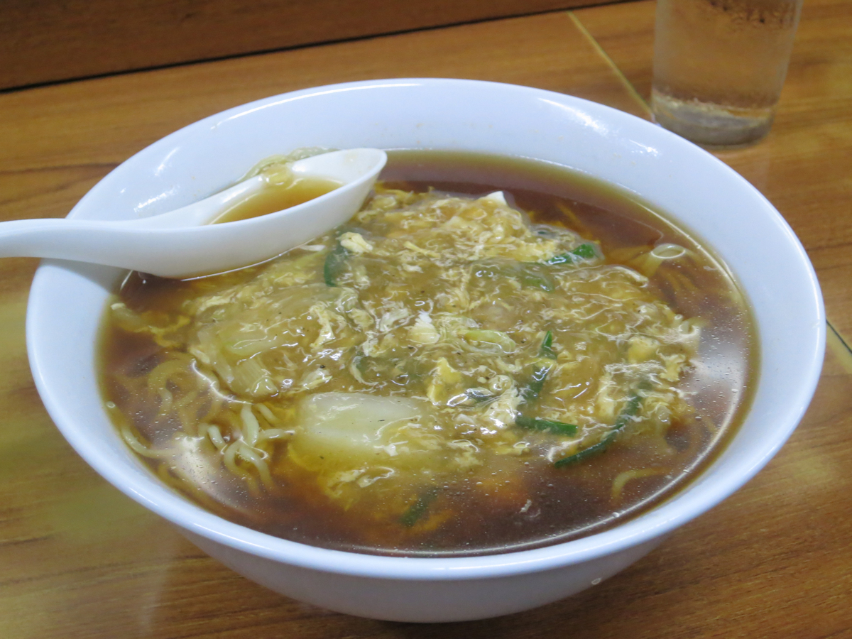 人参、玉ねぎ、ニラなどを中心とした野菜に玉子を合わせて中華餡とし、天津麺の天津のように乗せてあります。