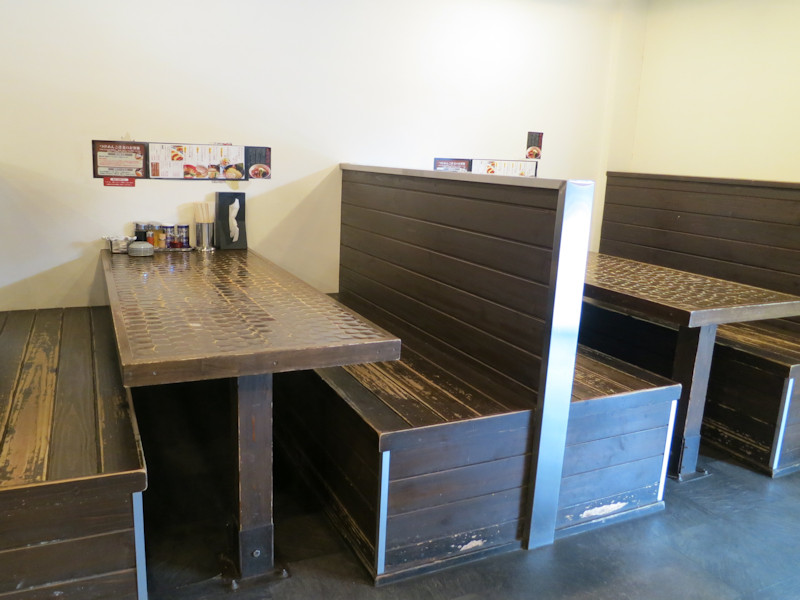 調理場の前にカウンター11席、入口左手には壁向きカウンター4席、4人掛けテーブルが3卓あります。
