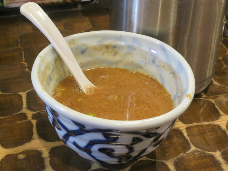 味見した感じでは鰹節と昆布のダシスープ、つけ汁の豚骨味が薄まって最後まで美味しくいただけました。