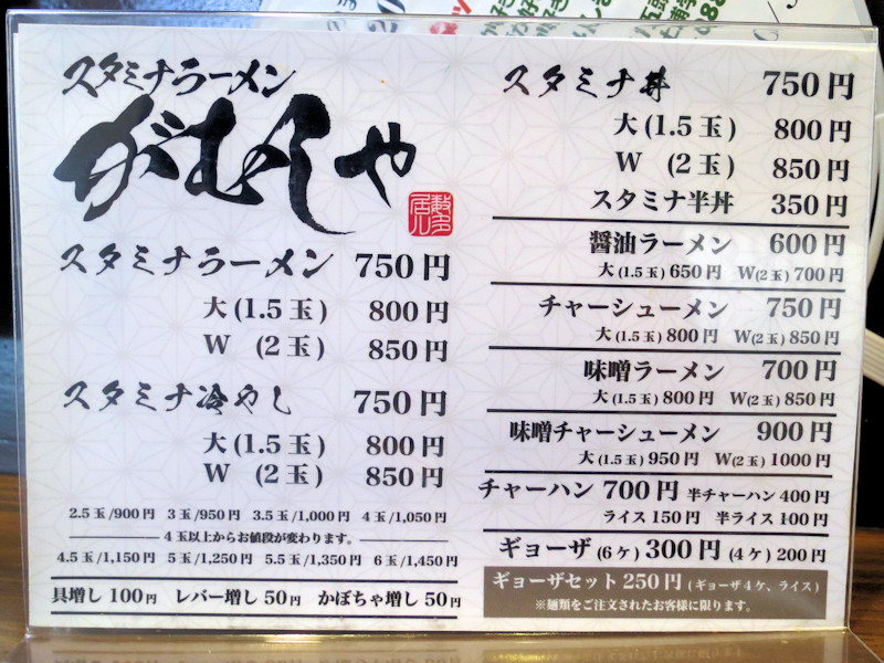 メニューはスタミナラーメン750円、スタミナ冷やし750円、スタミナ丼750円、醤油ラーメン600円、チャーシューメン750円、味噌ラーメン700円、味噌チャーシューメン900円。