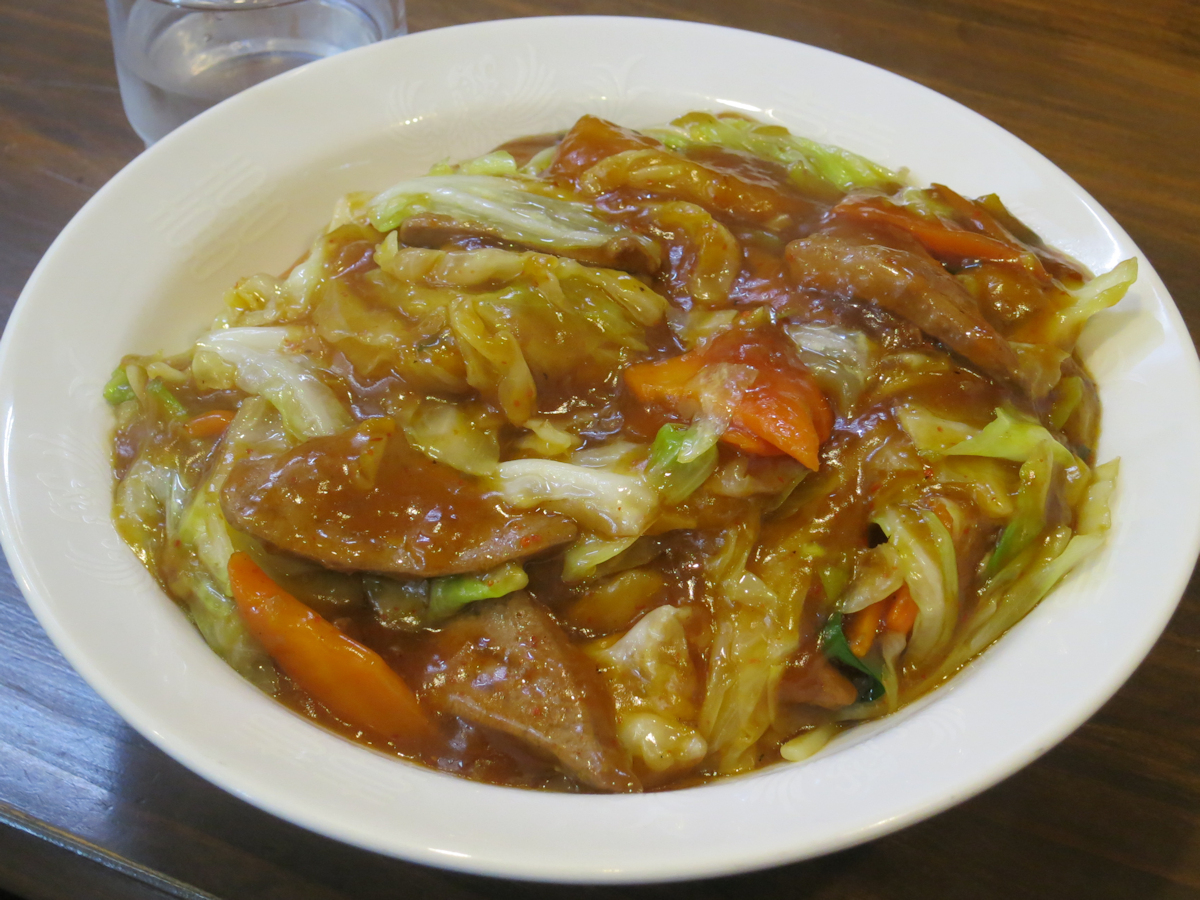 豚レバー、キャベツ、カボチャ、ニラを甘辛ソースで調理された甘辛餡が、茹で上げてから粗熱を取った程度の太麺に掛けられています。