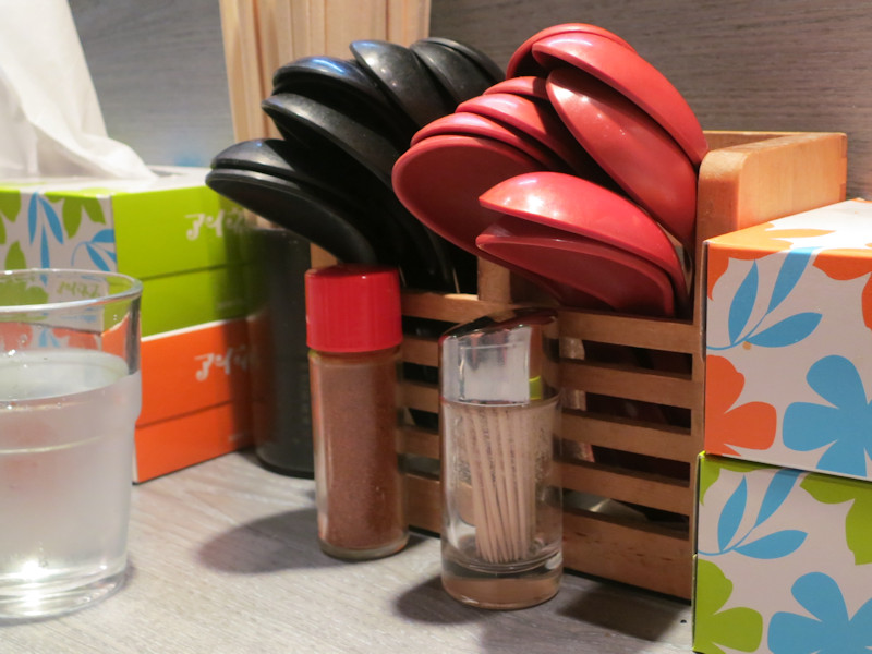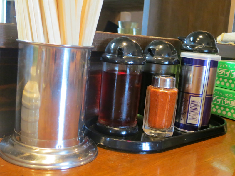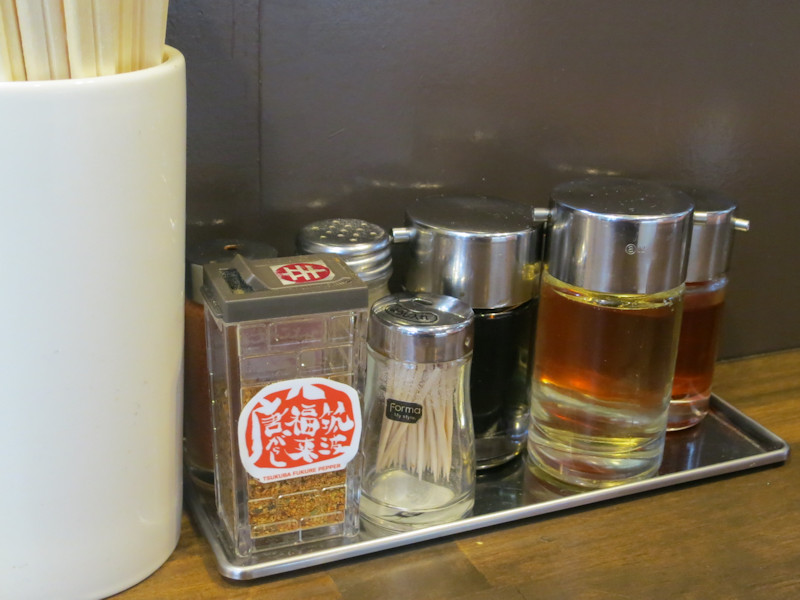 テーブルに置かれたカスターセットは醤油、酢、辣油、白胡椒、黒胡椒、七味唐辛子。