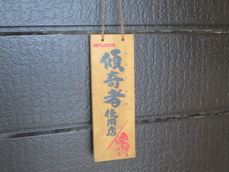 二重ドアを入ると、すぐ左手に「傾奇者使用店」と書かれた木札が目に入ります。