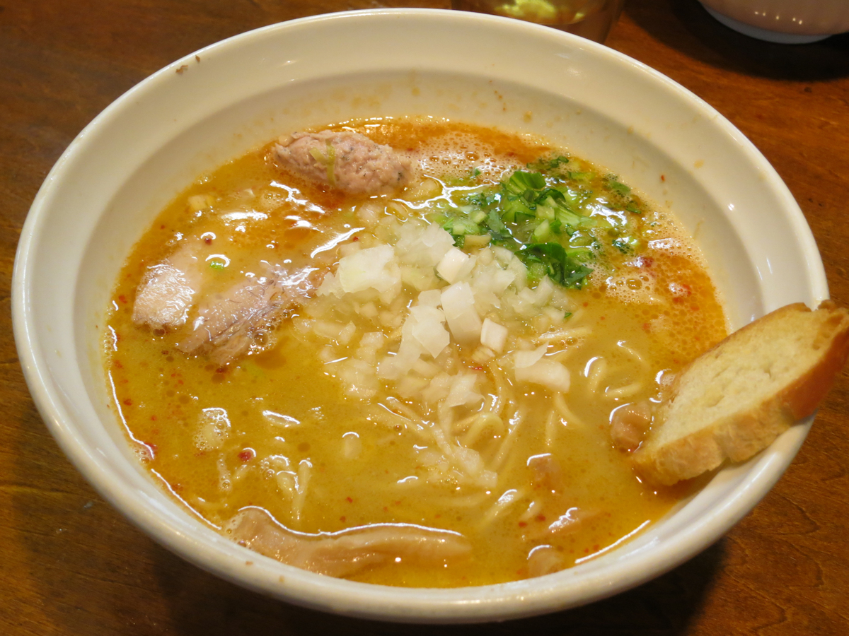 この手のスープは味わい続けると途中で飽きることが多いのですが、これまた定番で、チャーシュー、穂先メンマに加えて刻みタマネギ、フランスパン、鶏つくねをトッピングしてあります。